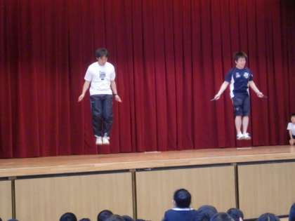 写真は、「二重跳びでどちらが長く飛び続けることができるか」の勝負です。