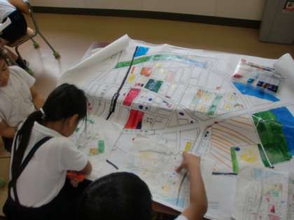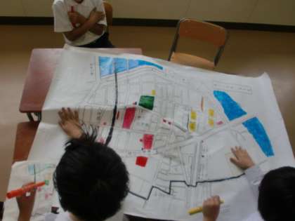 昨日の校区めぐりで見てきたものを、大きな地図に書き込んで整理しました。