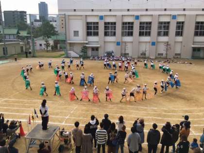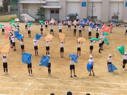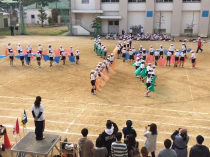4番めのプログラムは、4年生による団体演技だす。軽快なLAMPという曲に乗せて、全員がカラフルなビニール袋を旗めかせる楽しい演技です。
