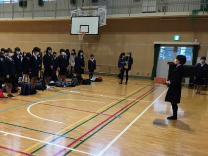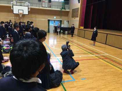 出発式では、修学旅行実行委員会が挨拶をしました。みんなで作った合言葉SDG s(S最後の小学校生活 D団結して G学年がひとつになる s修学旅行)を全員で唱和して、スタートです。