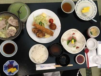 夕食のメニューは、ごはん・造り三種・豚陶板焼き・エビフライ・唐揚げ・ハンバーグ・ポテトサラダ・野菜サラダ・茶碗蒸し・味噌汁・漬物・フルーツ(パインアップル)です。