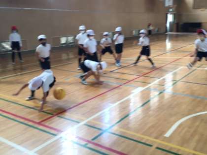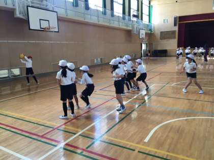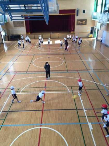 2年生とはいえ、自分の頭より大きなボールを上手に投げています。片手で持てない子は、両手で巧みに投げます。