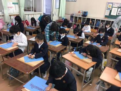 静寂の中、みんな真剣に取り組んでいます。初めて彫刻刀を持つ子もほとんどです。