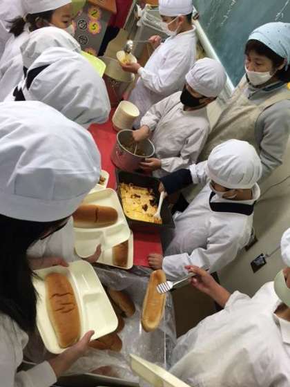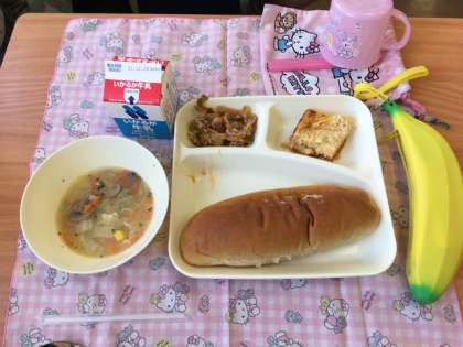 今日の給食献立は、黒糖パン・豚肉のケチャップソテー・コーンスープ・焼きプリン・牛乳です。