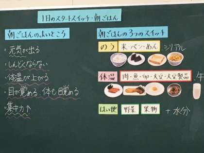 5年生での内容は、朝ごはんについてです。朝ごはんを食べることで、色んないいことがあります。食べることで体温が上がり、脳に血液が回って、頭がスッキリします。勉強がしやすくなります。