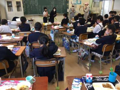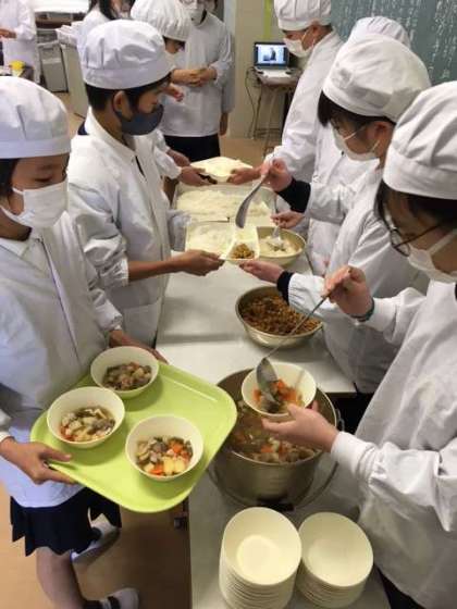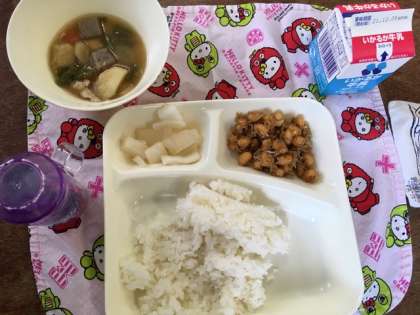 今日の給食献立は、ごはん・鶏肉と野菜の煮物・じゃこ豆・かぶのゆず風味・牛乳です。