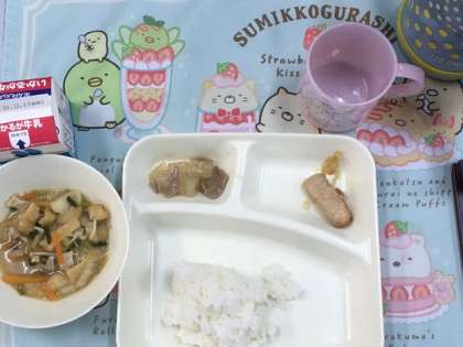 今日の給食献立は、ごはん・鶏肉の甘辛焼き・だいこんの煮物・みそ汁・牛乳です。