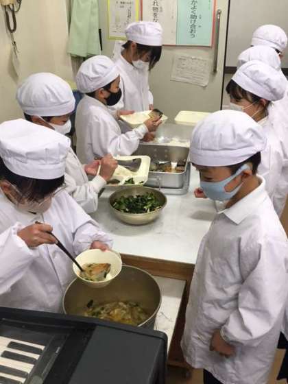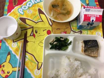 今日の給食献立は、ごはん・さばのみぞれかけ・こまつ菜の煮びたし・すまし汁・牛乳です。