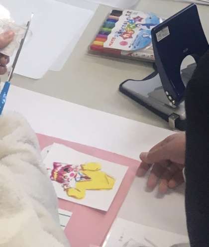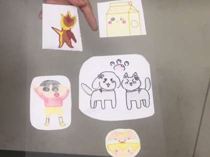 マンガクラブでは、マンガを描いてラミネートしてキーホルダーを作りました。かわいい絵が並んでいます。