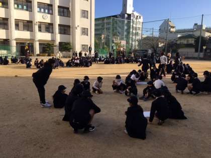 今日は木曜日、児童集会の日です。今日の内容は「お絵かきリレー」です。班ごとで班員が順番に似顔絵の完成をめざして、少しずつ描いていきます。