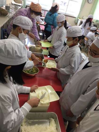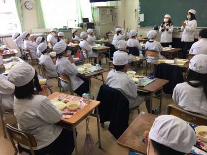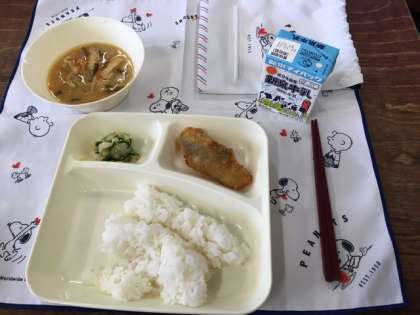 今日の給食献立は、ごはん・たらフライ・きくなと白菜の胡麻和え・さつま芋のみそ汁・牛乳です。
