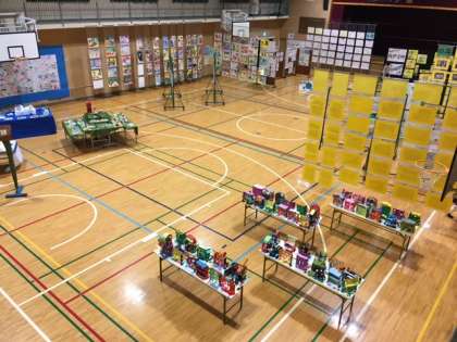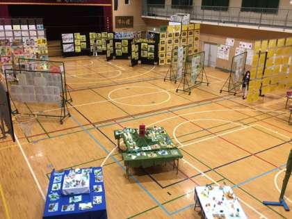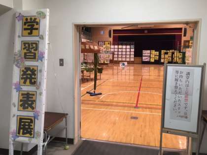 体育館(講堂)では今日から「学習発表展」を開催しています。日頃の学習活動で制作した作品や調べ学習の成果などを展示しています。