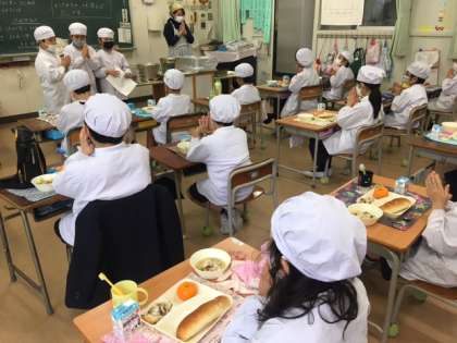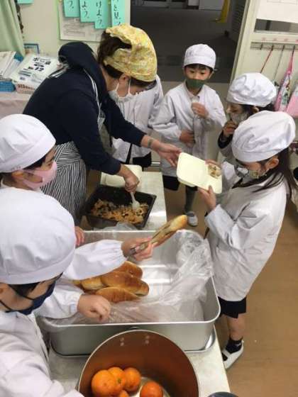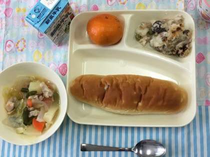 今日の給食献立は、おさつパン・きのこのドリア・鶏肉とじゃがいものスープ煮・みかん・牛乳です。