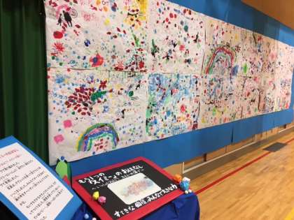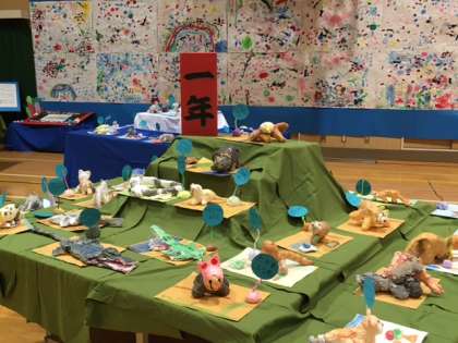 1年生は、「ほうじんどうぶつえん」の動物たちと、「もう1つのスイミーのおはなし」という海を描きました。