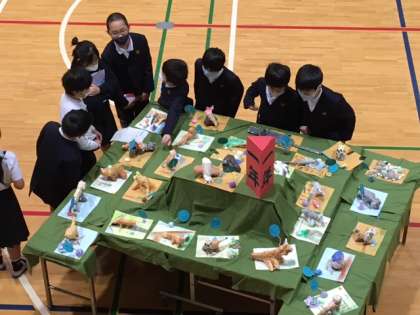 動物たちは、新聞紙で作った型に紙粘土をつけて色を塗りました。楽しくてかわいい動物園ができあがりました。