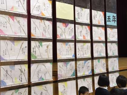 一人一人が描いた稲穂の絵と一句。「一つぶに みんなの思い つまってる」。