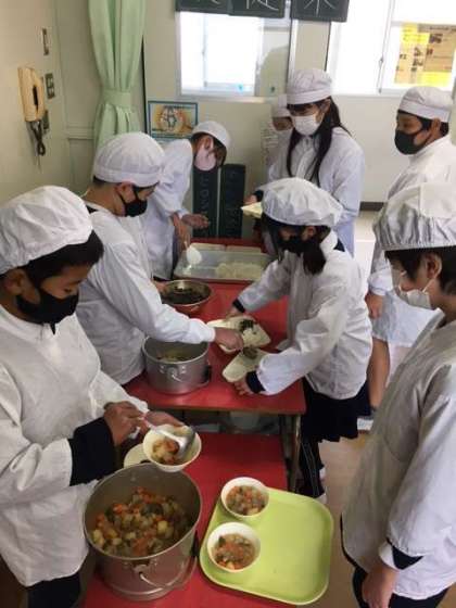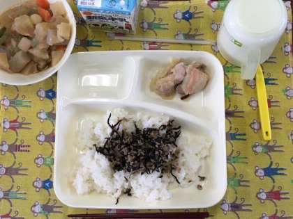 今日の給食献立は、ごはん・鶏肉のゆず塩焼き・含め煮・魚ひじきそぼろ・牛乳です。
