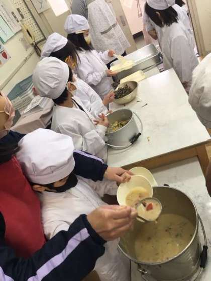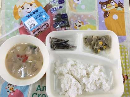 今年最初の給食は、お正月献立で、れんこんのちらし寿司・ごまめ・雑煮・牛乳です。