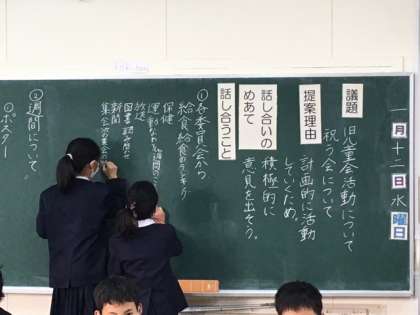児童会代表委員会では、各委員会の報告の後、あいさつ運動の当番を決めたり、卒業を祝う会について協議しました。