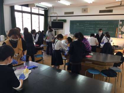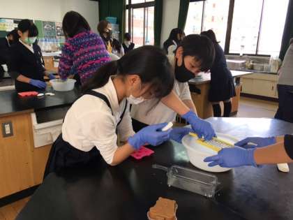 保健委員会では、石けんづくりをしました。小さくなった使いさしの石鹸を、おろし金で細かくして、お湯で溶かして楽しくてかわいい形の石鹸に作り替えます。