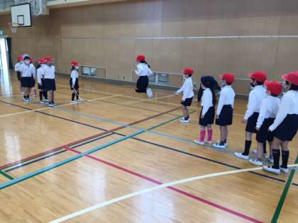 今は、昔のゴム跳びのような遊びもないので、初めての子にはなかなか難しいようですね。何度もするうちに、だんだんと慣れてきて、跳べる子も出てきました。