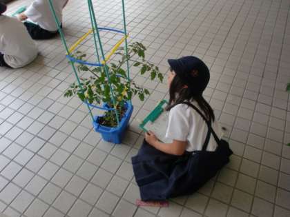 前に植えた苗(ミニトマト、ピーマン、オクラ、ナス)の成長の様子を観察しノートに記録しています。