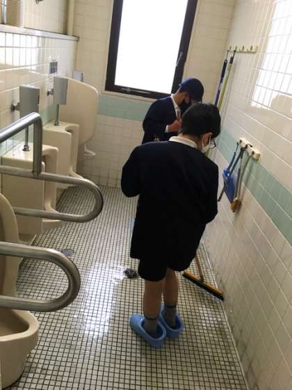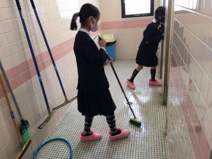 南館2階のトイレは6年生の担当です。だいたい1年生が使っています。6年生の当番の人が、毎日、トイレ用洗剤を使ってきれいにきれいにしてくれています。