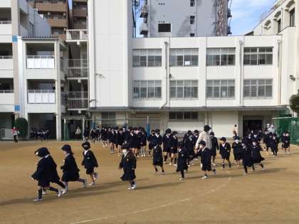 地震が起きた想定で、机の下に避難した後、一旦揺れが収まった時に、運動場に避難します。