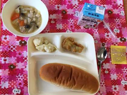 今日の給食献立は、コッペパン・白身魚フリッター・カリフラワーのサラダ・洋風煮・アプリコットジャム・牛乳です。