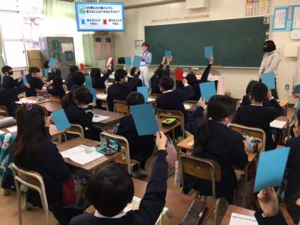 5年生の授業です。今日はゲストティーチャーとして、サントリーから来ていただいて「水育」をしていただきました。
