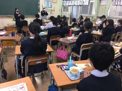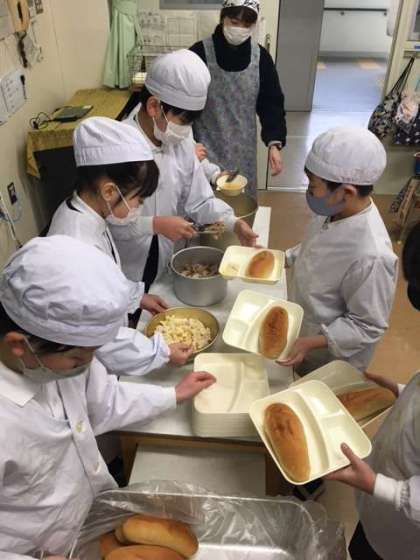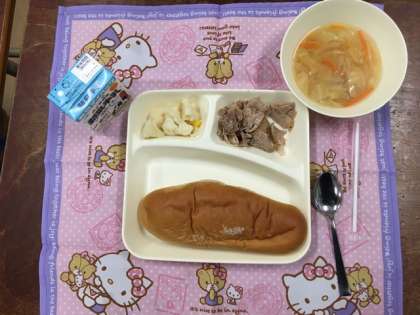 今日の給食献立は、黒糖パン・豚肉のガーリック焼き・カリフラワーとコーンのサラダ・スープ・牛乳です。