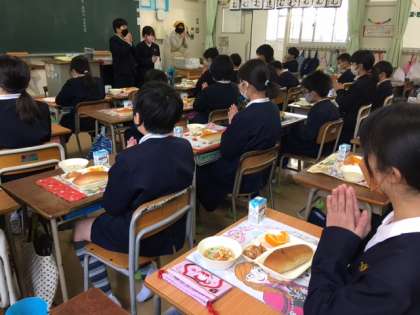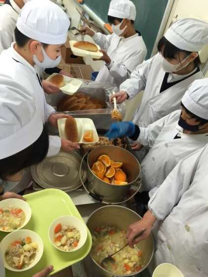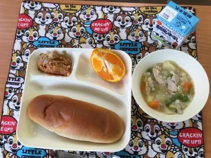 今日の給食献立は、黒糖パン・豆腐のミートグラタン・押麦と野菜のスープ煮・デコポン・牛乳です。