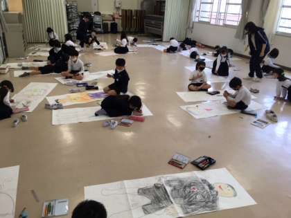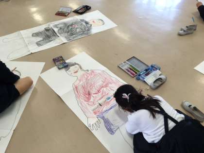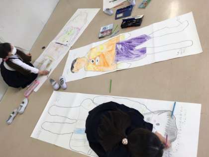 まず、紙の上に寝転んで、友だちに鉛筆で輪郭を描いてもらいます。そこに顔を描いて、服を着せて、色を塗っていきます。