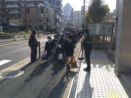 今日から新学期が始まりました。新しい班長さんを先頭に、一年生も初登校です。