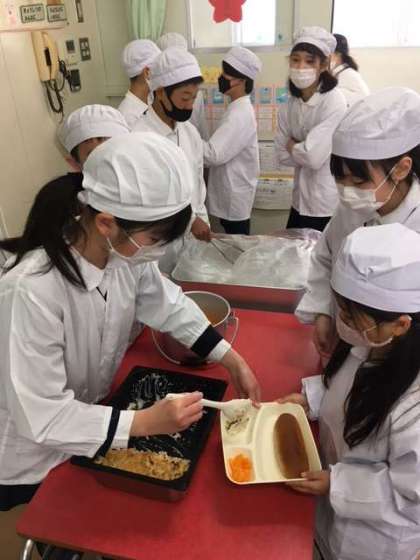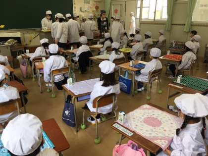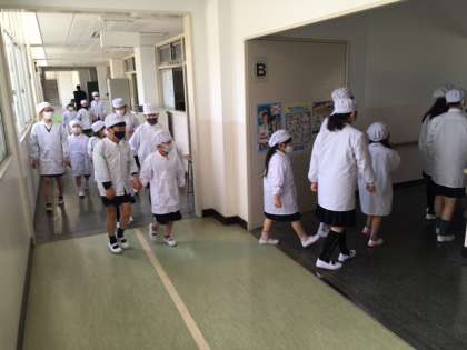 今日、一年生は初めての給食です。一年生の給食係の子は、6年生に手をつないでもらって、調理場へ行きます。