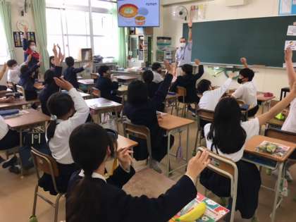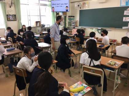 5年生の英語の様子の授業です。今日は、C-NET(Osaka City Native English Teacher)の授業の日です。春からネイティブティーチャーも変わりました。アメリカが故郷の元気な先生です。