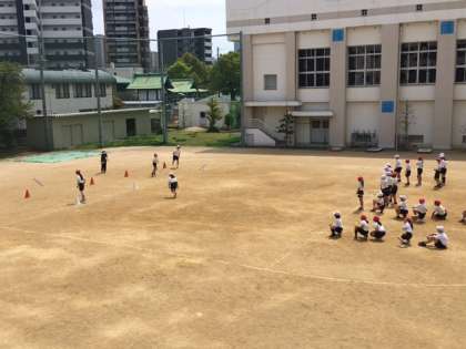 5年生の体育の授業では、ダッシュと輪くぐりと輪投げを組み合わせて、チーム対抗戦で盛り上がっていました。