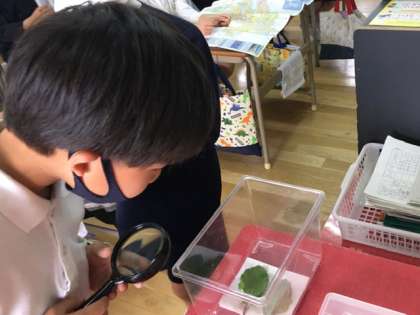 どんどん成長しています。可愛らしい幼虫に、どの子も興味津々(きょうみしんしん)です!