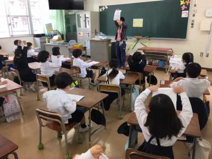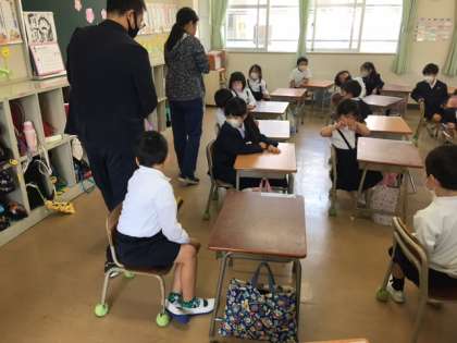 1年生の教室で、掃除の仕方の学習をしていました。ほうきの持ち方、使い方。ぞうきんの持ち方、使い方、しまい方。