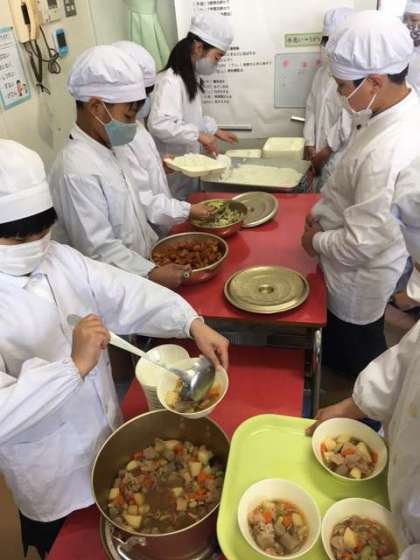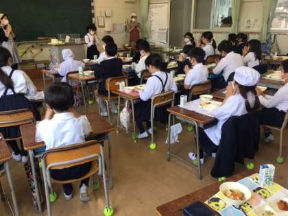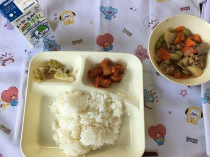 今日の給食献立は、ごはん・まぐろのオーロラ煮・豚肉と野菜の煮もの・キャベツの赤紫蘇あえ・牛乳です。