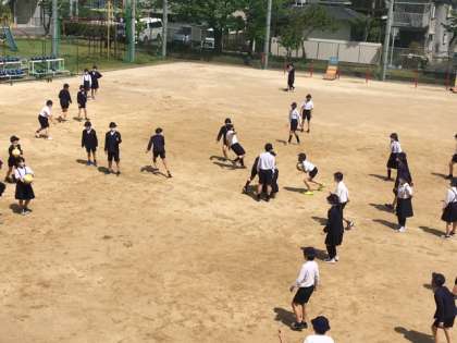 今日は6年生の番です。ギラギラするほどの晴天下、6年生みんなが運動場に出て遊んでいます。