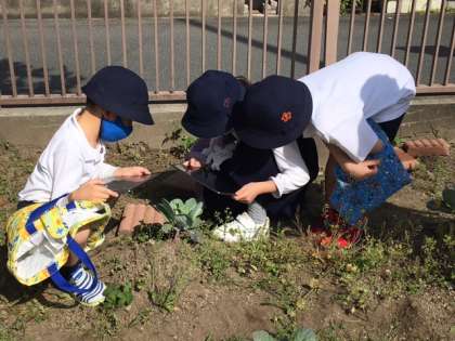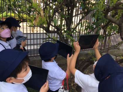 3年生の理科の授業で、校庭の樹木の葉っぱにいる蝶々の卵や幼虫の観察をしています。タブレットで撮影します。