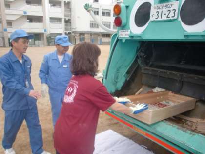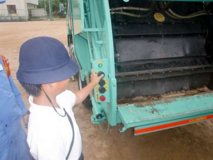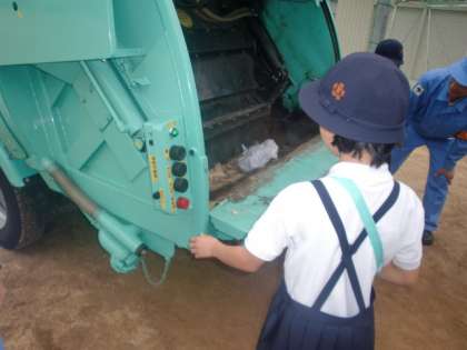 (上)(中)それぞれに家から持ってきたごみを入れて、スイッチを押すとごみがパッカー車の中に押し込まれていきました。