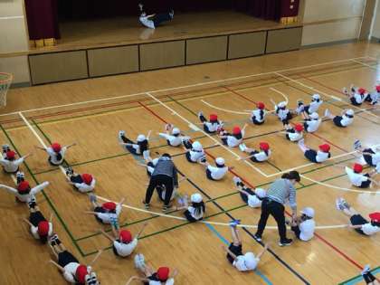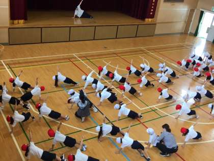 一年生の体育の授業です。3クラス揃って体操をしています。