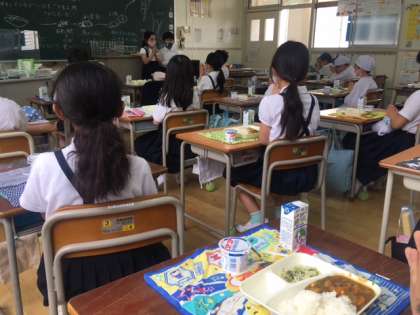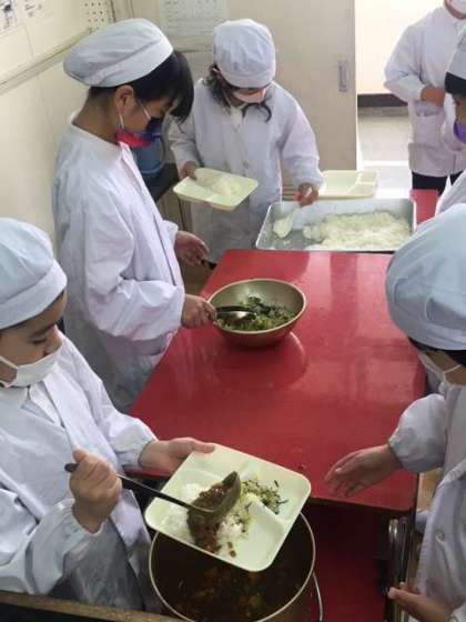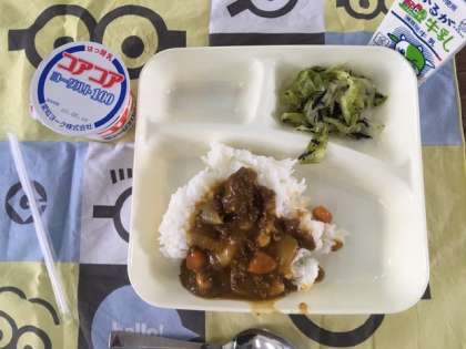 今日の給食献立は、牛肉と大豆のカレーライス・キャベツのひじきドレッシング・ヨーグルト・牛乳です。
