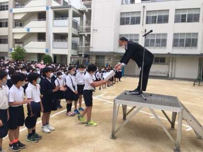 次に、校長先生から、知っている人でも知らない人でも声をかける運動をしている友人のお話がありました。その人は以前、大阪マラソンに出場した時、沿道に並ぶ知らない人たちからたくさんの応援をもらったことで勇気が出て走りきれました。そのことが忘れられず、大きなことはできなくても、知らない人でも声をかけて元気づけたり、笑顔になってもらうことはできるので、それを大事にしているそうです。