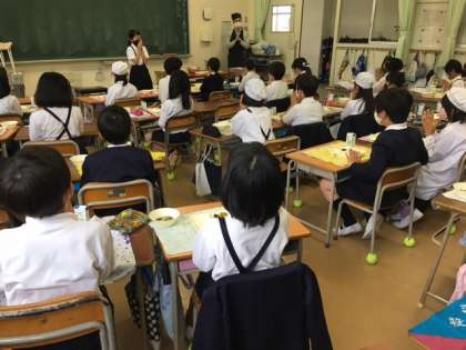 今日の給食献立は、豚丼・湯葉のすまし汁・かぼちゃの醤油焼き・牛乳です。