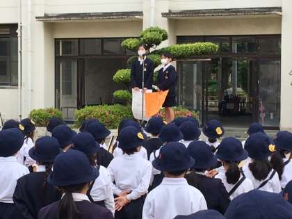 今日は月曜日、児童朝会の日です。暑くもなく寒くもなく、曇り空ですが朝会日和です。