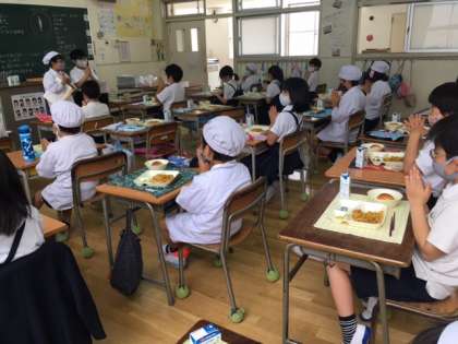 今日の給食献立は、黒糖パン・カレースパゲッティ・レタスとコーンのサラダ・固形チーズ・牛乳です。