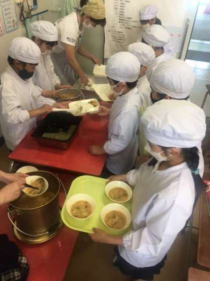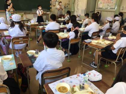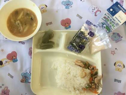 今日の給食献立は、かやくご飯・じゃがいもの味噌汁・抹茶ういろう・牛乳です。
